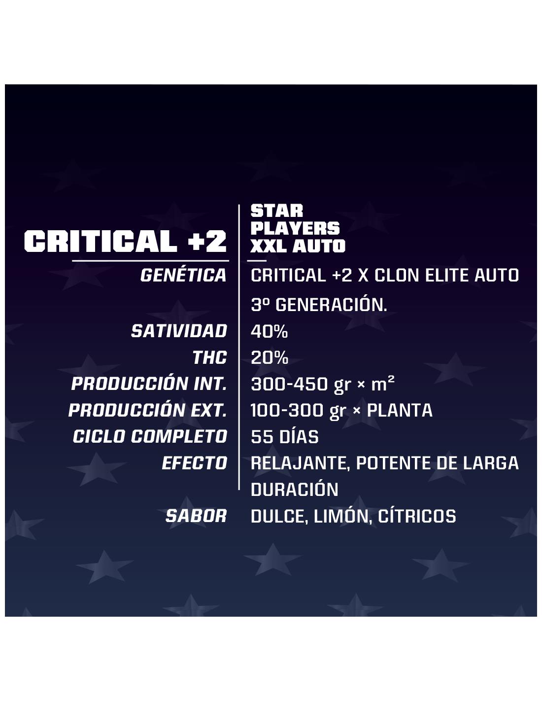 Critical + 2 XXL Auto es una gran genética para tu colección e ideal para compartir una rica comida, una tarde de risas con amigos o un buen libro.