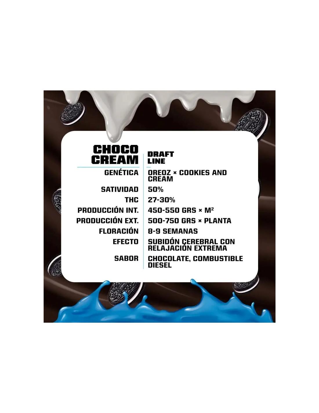 Este híbrido 50/50 se destaca por sus toques de chocolate con matices de combustible diesel, creando un perfil de sabor excepcionalmente dulce. Recomendada para problemas de insomnio, ansiedad, estrés crónico y depresión. Choco Cream Feminized nos ofrece un viaje que comienza con un subidón cerebral para desembocar en una relajación duradera. Se advierte que su intensidad puede resultar fuerte para consumidores novatos. Sus terpenos dominantes, incluyendo humuleno, cariofileno, limoneno, mirceno, betacarlifeno y linalol, ofrecen un perfil aromático único que no has experimentado antes.