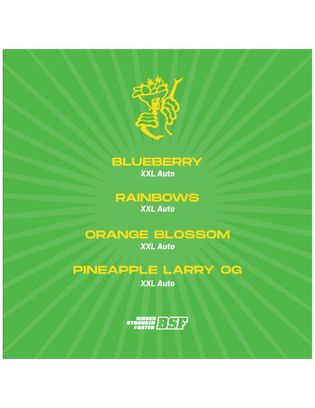 Tutti Frutti XXL Auto Mix. BSF Seeds presenta un nuevo mix autofloreciente. Tutti Frutti XXL Auto Mix es una explosión de sabor de 4 de las variedades más frutales de BSF Seeds en su versión automática; Auto Blueberry, Auto Rainbows, Auto Orange Blossom y Auto Pineapple Larry OG. Una increíble mezcla de terpenos separados en burbujas independientes.