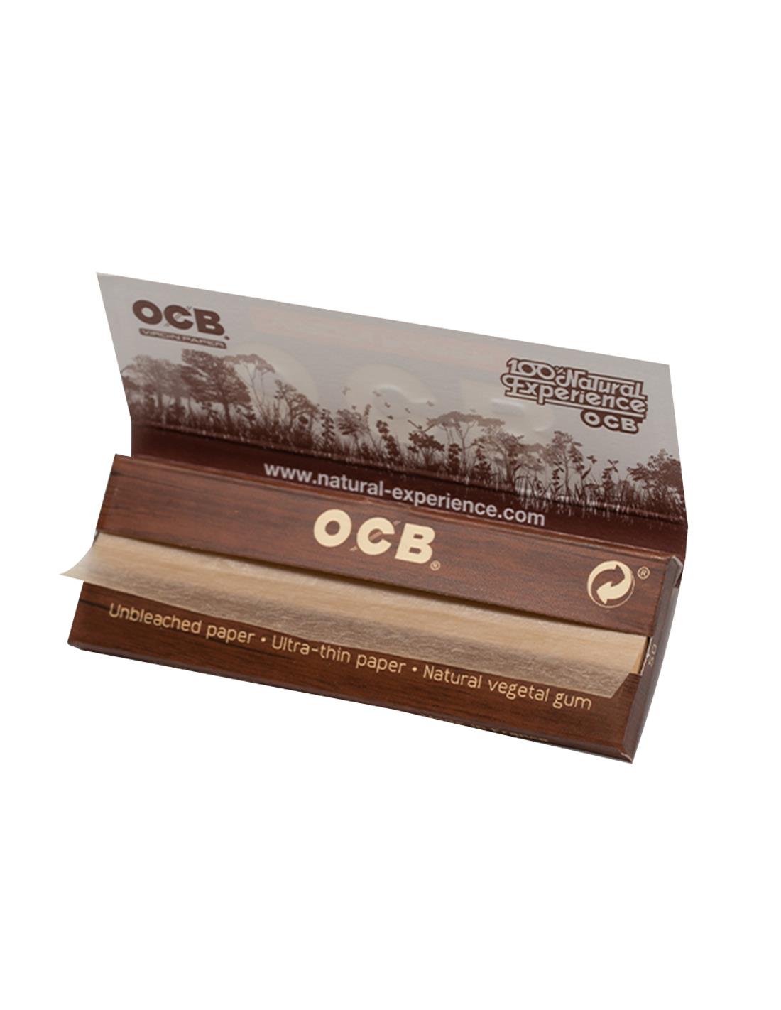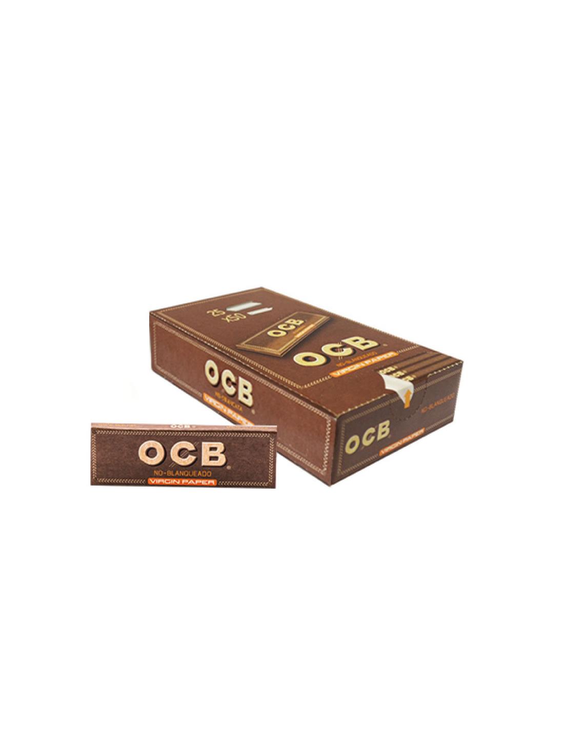 Papel de fumar OCB Virgin tamaño #11/4 de combustión lenta, ultra fino, con goma arabiga, sin blanqueado, libre de GMO, producción vegana y de fibras sostenibles. Contiene 50 hojas por librito. Color marrón.