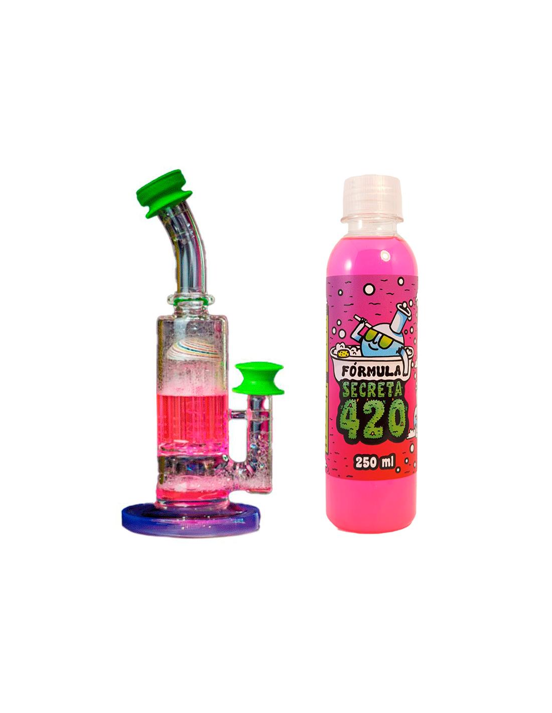 Fórmula Secreta 420 es el producto más concentrado del mercado, creado para la limpieza profunda de su parafernalia. Su formulación concentrada lo hace un producto eficaz en la remoción de resinas y grasas provenientes de compuestos orgánicos, es capaz de limpiar hasta en los rincones más difíciles gracias a la espuma. Limpia superficies de Pyrex, Silicona, Metal y Cerámica. INSTRUCCIONES DE USO ¡Prepara tu bong para la limpieza! Aplica agua tibia hasta eliminar los excesos de ceniza y resinas del interior de tu bong. Aplica 30 ml de fórmula secreta 420 y 30 ml de agua caliente al interior de tu bong Agita enérgicamente por 5 min hasta generar espuma, deja reposar y vuelve a agitar 5 min. Lavar con abundante agua, hasta eliminar todos los residuos de fórmula secreta 420. PRECAUCIONES DE SEGURIDAD Determinar las condiciones de uso seguro del producto es responsabilidad del usuario Necesidad de uso del guante y protección ocular. Evitar todo contacto con los ojos, la piel o la ropa. Mantener en envase original cerrado en lugar fresco, seco y ventilado. Mantener alejado del alcance de los niños. No comer, beber o fumar mientras se manipula este producto. ESPECIFICACIONES TÉCNICAS Apariencia: Líquido no viscoso Color: Rosa Flúor Olor: Cherry Densidad: a 20 °C: 0.9-1.0 gr/cc PH producto puro: 13.0 - 14.0 Solubilidad: Completa en agua fría o caliente, blanda o dura Estabilidad: Condiciones normales 1 año mínimo Inflamabilidad: No inflamable