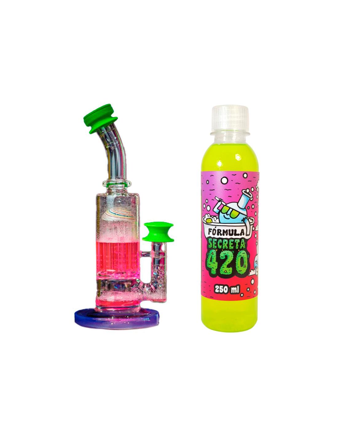 Fórmula Secreta 420 es el producto más concentrado del mercado, creado para la limpieza profunda de su parafernalia. Su formulación concentrada lo hace un producto eficaz en la remoción de resinas y grasas provenientes de compuestos orgánicos, es capaz de limpiar hasta en los rincones más difíciles gracias a la espuma. Limpia superficies de Pyrex, Silicona, Metal y Cerámica. INSTRUCCIONES DE USO ¡Prepara tu bong para la limpieza! Aplica agua tibia hasta eliminar los excesos de ceniza y resinas del interior de tu bong. Aplica 30 ml de fórmula secreta 420 y 30 ml de agua caliente al interior de tu bong Agita enérgicamente por 5 min hasta generar espuma, deja reposar y vuelve a agitar 5 min. Lavar con abundante agua, hasta eliminar todos los residuos de fórmula secreta 420. PRECAUCIONES DE SEGURIDAD Determinar las condiciones de uso seguro del producto es responsabilidad del usuario Necesidad de uso del guante y protección ocular. Evitar todo contacto con los ojos, la piel o la ropa. Mantener en envase original cerrado en lugar fresco, seco y ventilado. Mantener alejado del alcance de los niños. No comer, beber o fumar mientras se manipula este producto. ESPECIFICACIONES TÉCNICAS Apariencia: Líquido no viscoso Color: Rosa Flúor Olor: Cherry Densidad: a 20 °C: 0.9-1.0 gr/cc PH producto puro: 13.0 - 14.0 Solubilidad: Completa en agua fría o caliente, blanda o dura Estabilidad: Condiciones normales 1 año mínimo Inflamabilidad: No inflamable