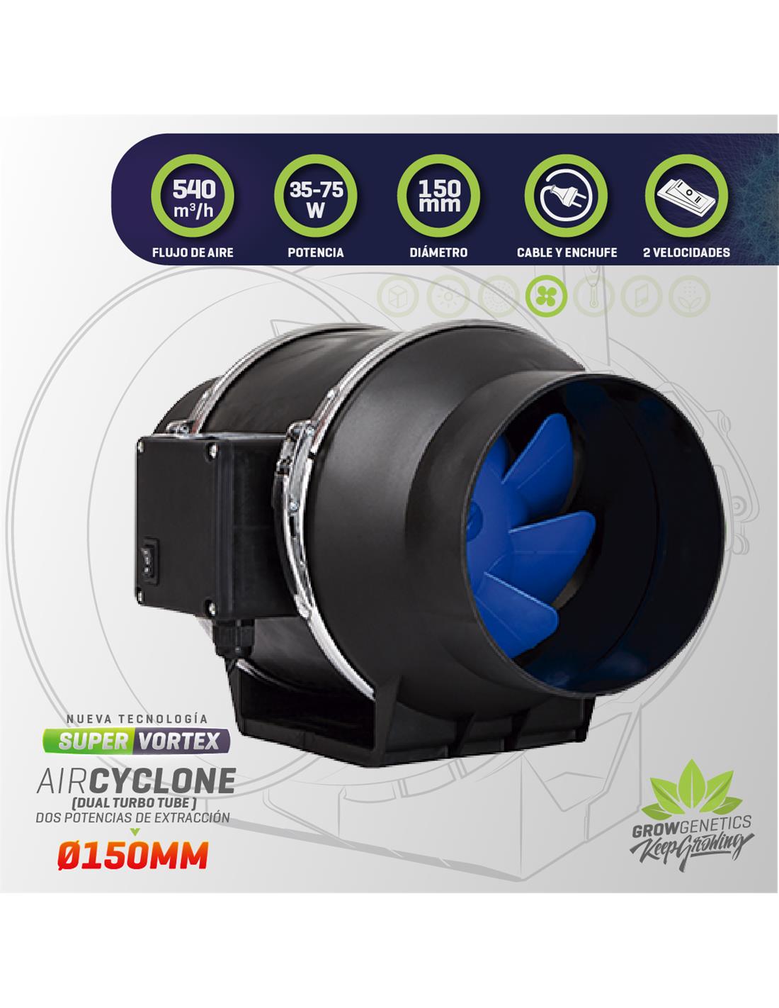 La nueva línea de extractores de Grow Genetics incorpora componentes de alta calidad, materiales reciclables y amigables con el medio ambiente. Gracias a su tecnología Super Vortex cada vez son más los profesionales del cultivo que prefieren nuestros extractores, disponible en 100mm, 125mm y 150mm